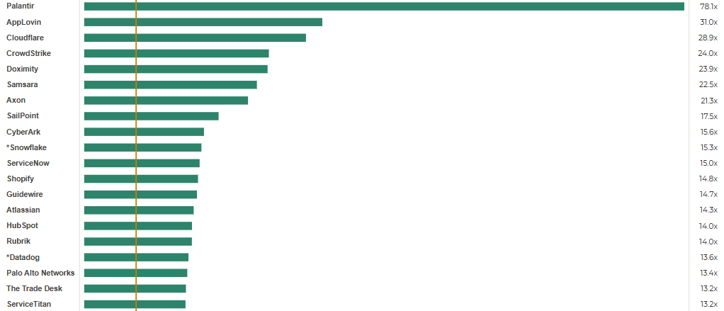 The multiples shown are calculated by dividing enterprise value (market cap + debt - cash) by the company's projected NTM revenue.